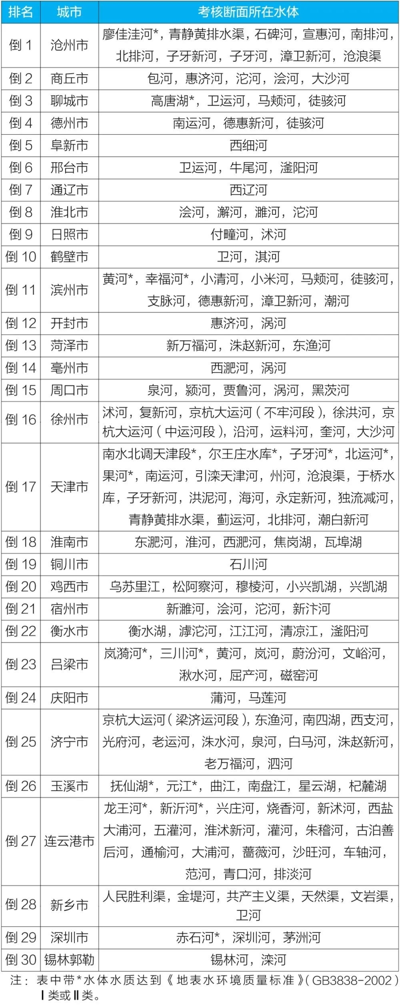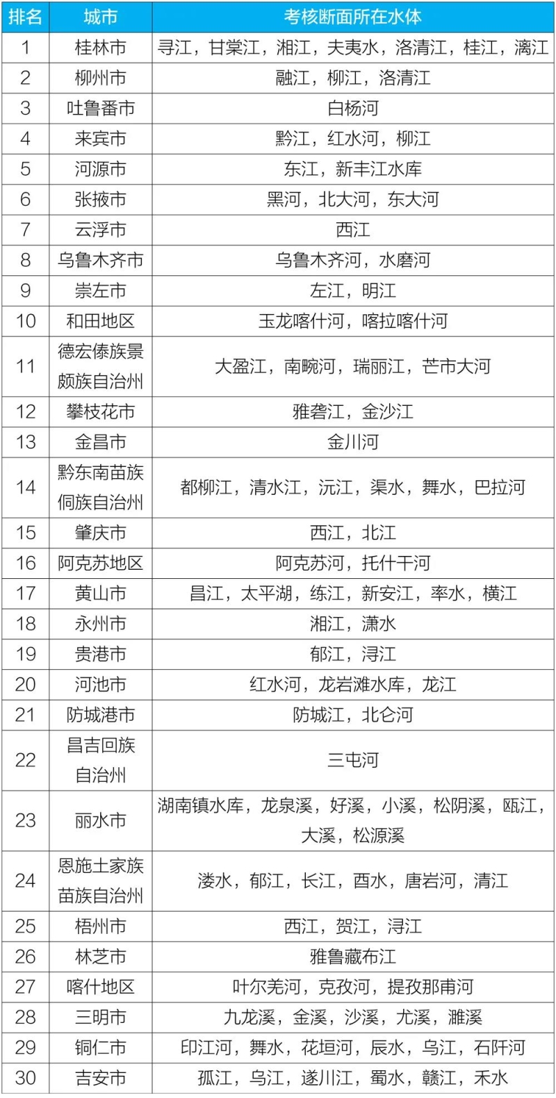2020年10月國(guó)家地表水考核斷面水環(huán)境質(zhì)量狀況排名前30位城市及所在水體