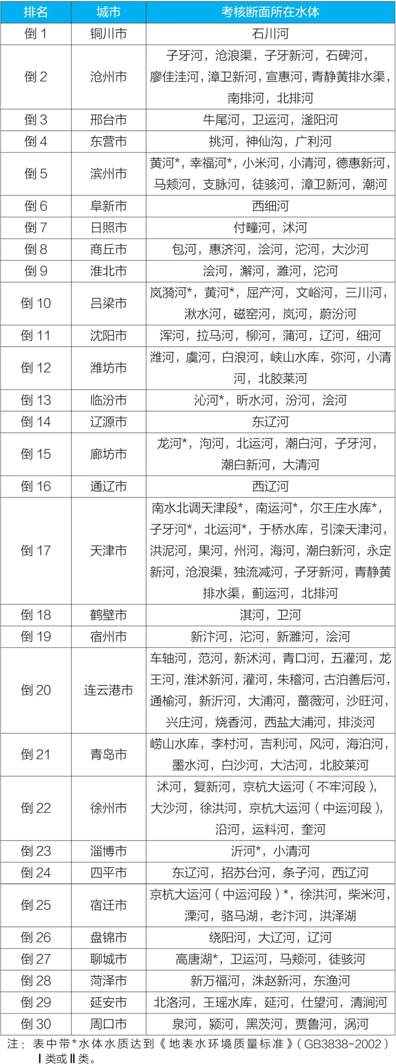 2020年10月國(guó)家地表水考核斷面水環(huán)境質(zhì)量狀況排名后30位城市及所在水體
