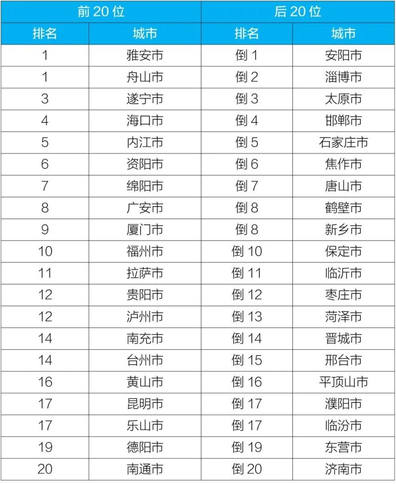 2020年10月168個(gè)重點(diǎn)城市排名前20位和后20位城市名單
