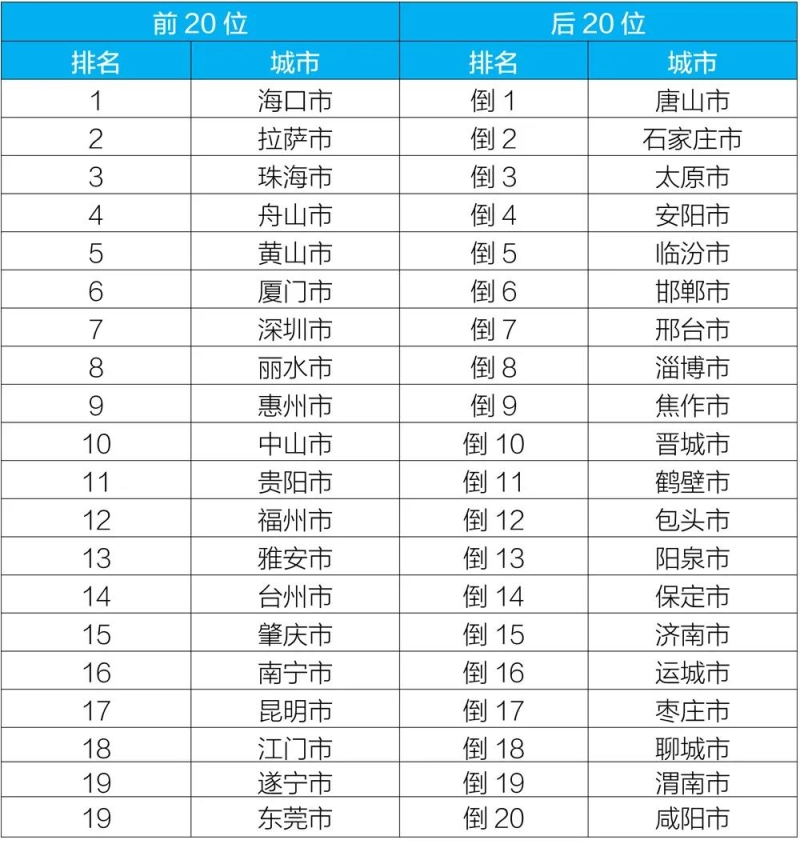 1-10月,168個(gè)重點(diǎn)城市中,唐山、石家莊和太原市等城市空氣質(zhì)量相對(duì)較差(從倒數(shù)第1名至倒數(shù)第20名);??凇⒗_和珠海市等城市空氣質(zhì)量相對(duì)較好(從第1名至并列第19名),見附表6。