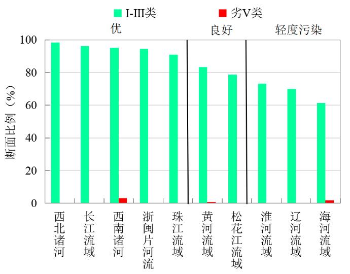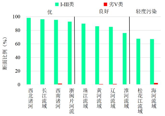 圖3 2020年10月七大流域和西南、西北諸河及浙閩片河流水質(zhì)類別比例