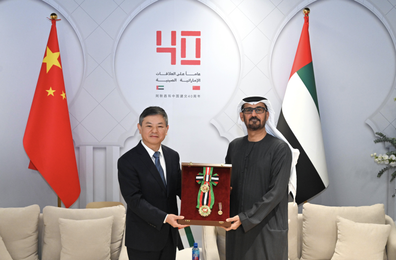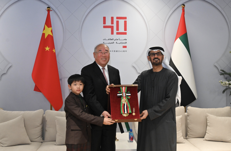 11月30日,阿聯(lián)酋駐華使館舉行“扎耶德二世一等勛章”頒授儀式,阿聯(lián)酋駐華大使哈馬迪代表總統(tǒng)穆罕默德為中國(guó)生態(tài)環(huán)境部部長(zhǎng)黃潤(rùn)秋、原中國(guó)氣候變化事務(wù)特使解振華頒授勛章,以表彰他們?yōu)槁?lián)合國(guó)氣候變化迪拜大會(huì)(COP28)取得成功所做的突出貢獻(xiàn)。