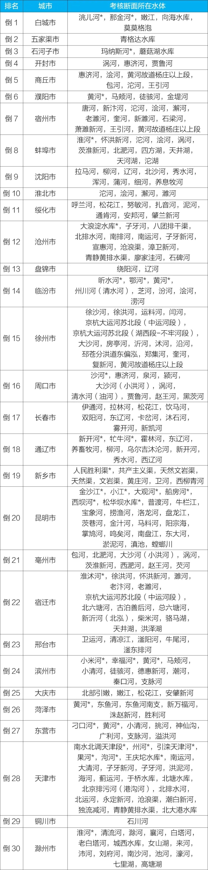 2022年1—9月國(guó)家地表水考核斷面水環(huán)境質(zhì)量狀況排名后30位城市及所在水體