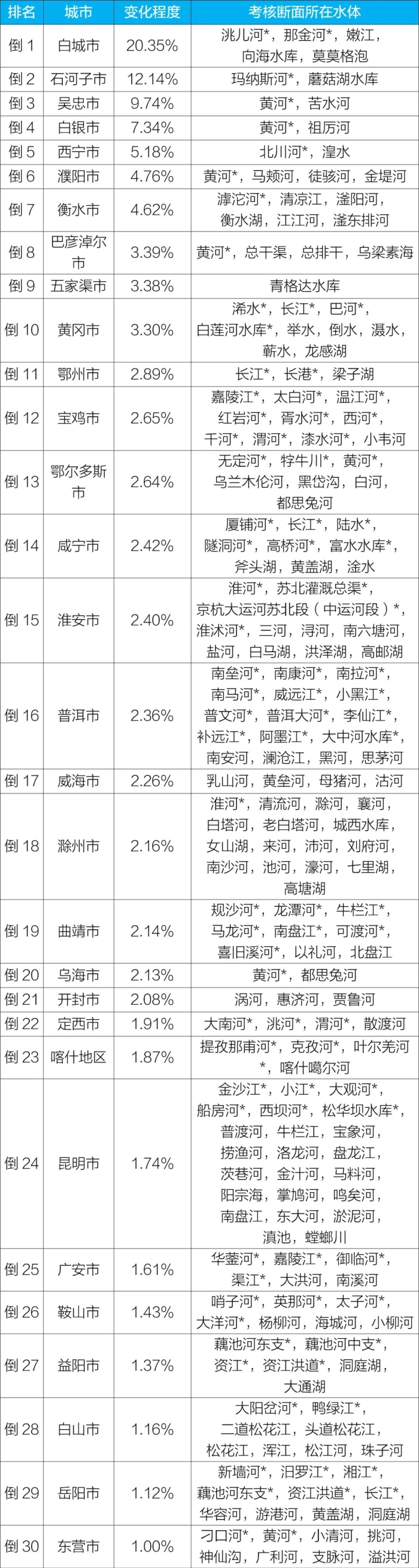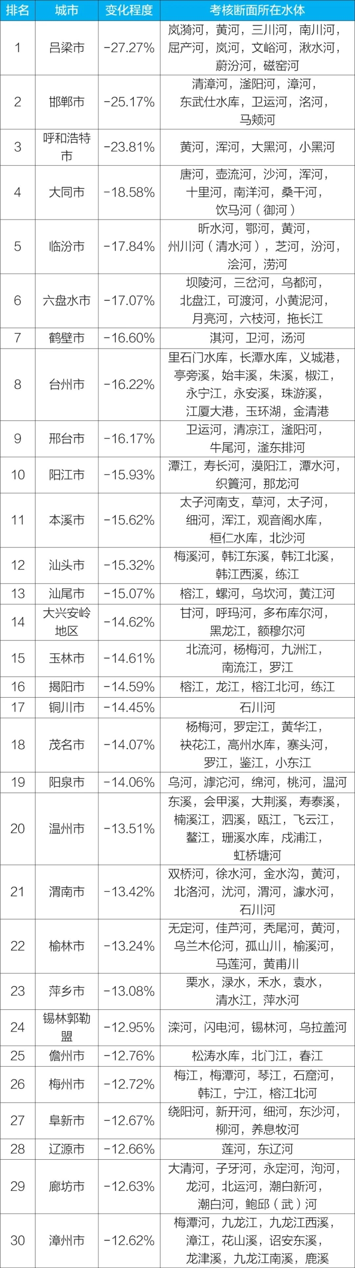 呂梁、邯鄲和呼和浩特等30個(gè)城市國(guó)家地表水考核斷面水環(huán)境質(zhì)量變化情況相對(duì)較好(從第1名至第30名),白城、石河子和吳忠等30個(gè)城市國(guó)家地表水考核斷面水環(huán)境質(zhì)量變化情況相對(duì)較差(從倒數(shù)第1名至倒數(shù)第30名)。見附表3—附表4。