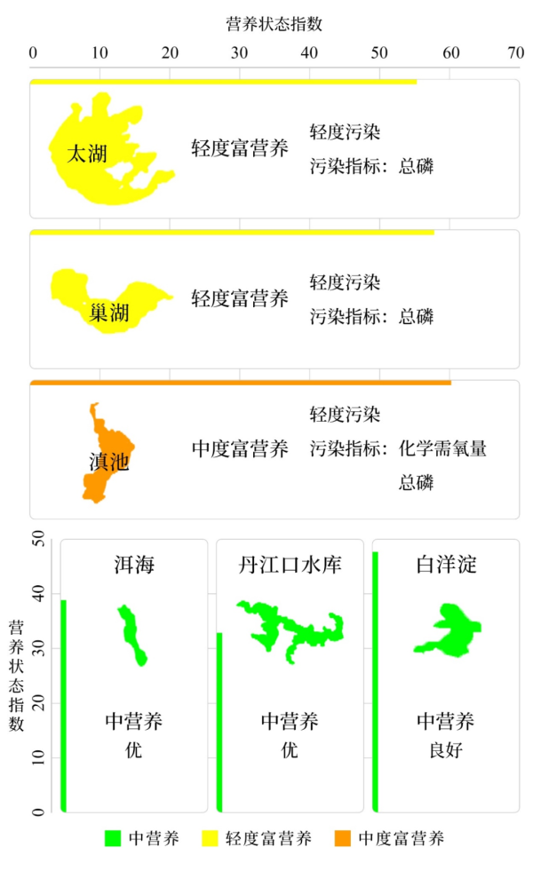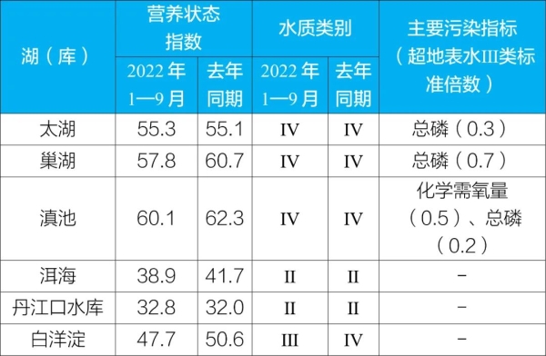 第三季度,監(jiān)測(cè)的210個(gè)重點(diǎn)湖(庫(kù))中,水質(zhì)優(yōu)良(Ⅰ—Ⅲ類)湖庫(kù)個(gè)數(shù)占比68.1%,同比下降0.3個(gè)百分點(diǎn);劣Ⅴ類水質(zhì)湖庫(kù)個(gè)數(shù)占比4.8%,同比下降1.4個(gè)百分點(diǎn)。主要污染指標(biāo)為總磷、化學(xué)需氧量和高錳酸鹽指數(shù)。199個(gè)監(jiān)測(cè)營(yíng)養(yǎng)狀態(tài)的湖(庫(kù))中,重度富營(yíng)養(yǎng)的1個(gè),占0.5%;中度富營(yíng)養(yǎng)的22個(gè),占11.1%;輕度富營(yíng)養(yǎng)的45個(gè),占22.6%;其余湖(庫(kù))為中營(yíng)養(yǎng)或貧營(yíng)養(yǎng)狀態(tài)。其中,太湖為輕度污染、輕度富營(yíng)養(yǎng),主要污染指標(biāo)為總磷;巢湖為中度污染、中度富營(yíng)養(yǎng),主要污染指標(biāo)為總磷;滇池為中度污染、中度富營(yíng)養(yǎng),主要污染指標(biāo)為化學(xué)需氧量和總磷;洱海水質(zhì)為優(yōu)、中營(yíng)養(yǎng);丹江口水庫(kù)水質(zhì)為優(yōu)、貧營(yíng)養(yǎng);白洋淀水質(zhì)良好、中營(yíng)養(yǎng)。