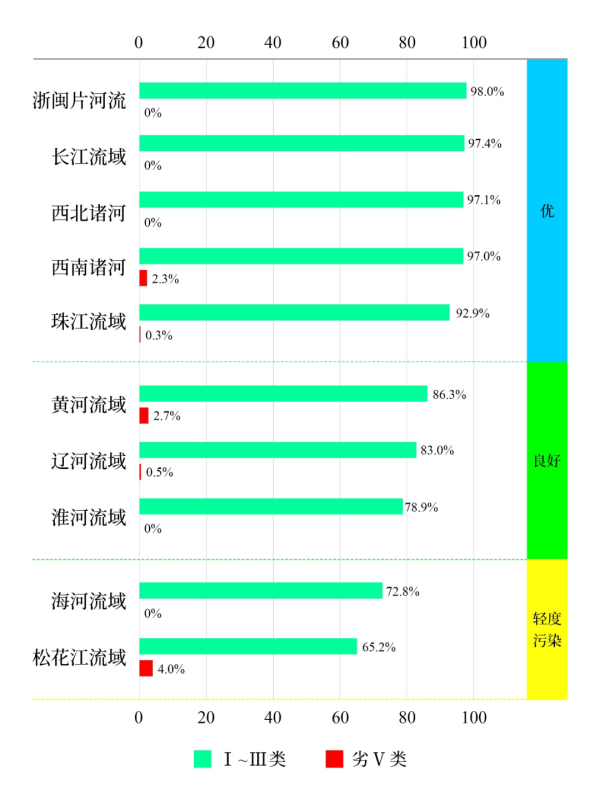 1—9月,長(zhǎng)江、黃河、珠江、松花江、淮河、海河、遼河等七大流域及西北諸河、西南諸河和浙閩片河流水質(zhì)優(yōu)良(Ⅰ—Ⅲ類)斷面比例為88.5%,同比上升4.8個(gè)百分點(diǎn);劣Ⅴ類斷面比例為0.7%,同比下降0.3個(gè)百分點(diǎn)。主要污染指標(biāo)為化學(xué)需氧量、高錳酸鹽指數(shù)和總磷。其中,浙閩片河流、長(zhǎng)江流域、西北諸河、西南諸河和珠江流域水質(zhì)為優(yōu);黃河、遼河和淮河流域水質(zhì)良好;海河和松花江流域?yàn)檩p度污染。