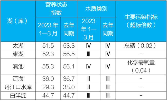 1—3月,監(jiān)測的195個重點湖(庫)中,水質優(yōu)良(Ⅰ—Ⅲ類)湖庫個數(shù)占比81.0%,同比上升2.9個百分點;劣Ⅴ類水質湖庫個數(shù)占比4.6%,同比下降0.1個百分點。主要污染指標為總磷、化學需氧量和高錳酸鹽指數(shù)。186個監(jiān)測營養(yǎng)狀態(tài)的湖(庫)中,中度富營養(yǎng)的4個,占2.2%;輕度富營養(yǎng)的34個,占18.3%;其余湖(庫)為中營養(yǎng)或貧營養(yǎng)狀態(tài)。其中,太湖為輕度污染、輕度富營養(yǎng),主要污染指標為總磷;巢湖水質良好、輕度富營養(yǎng);滇池為輕度污染、輕度富營養(yǎng),主要污染指標為化學需氧量;洱海水質為優(yōu)、中營養(yǎng);丹江口水庫水質為優(yōu)、貧營養(yǎng);白洋淀水質良好、中營養(yǎng)。