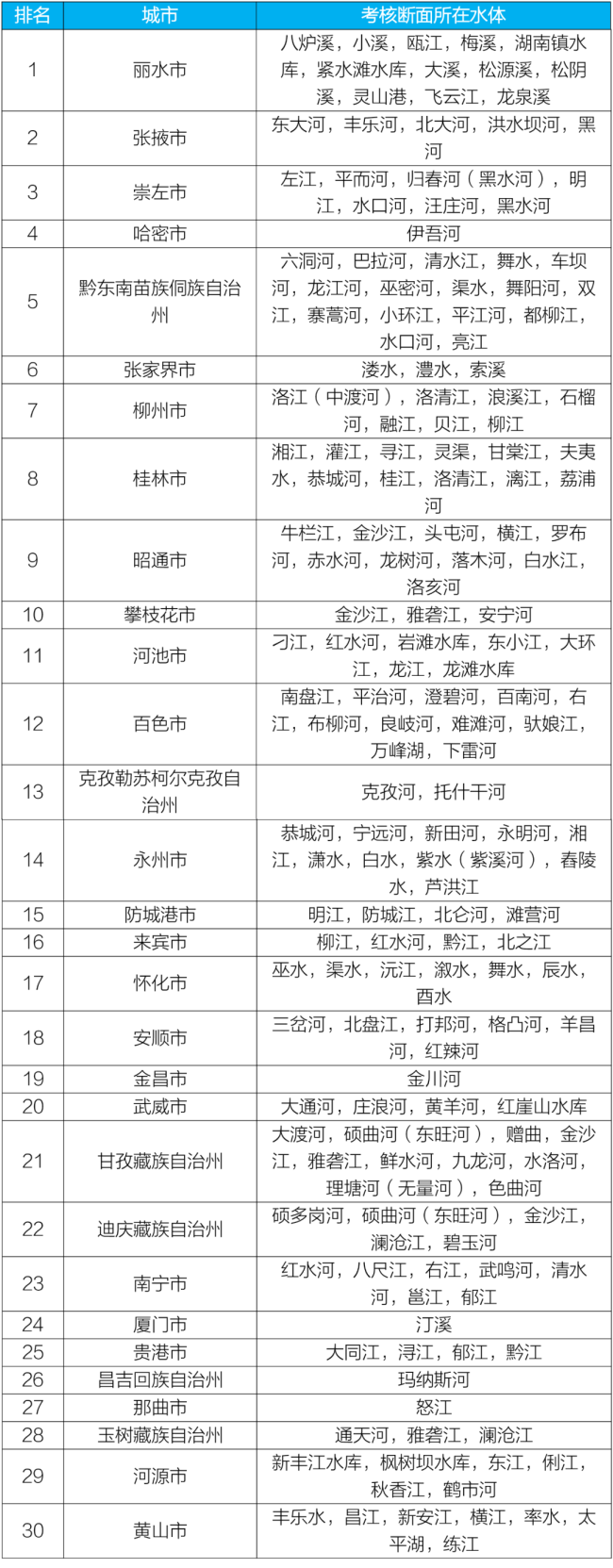 2023年1—3月國家地表水考核斷面水環(huán)境質量狀況排名前30位城市及所在水體
