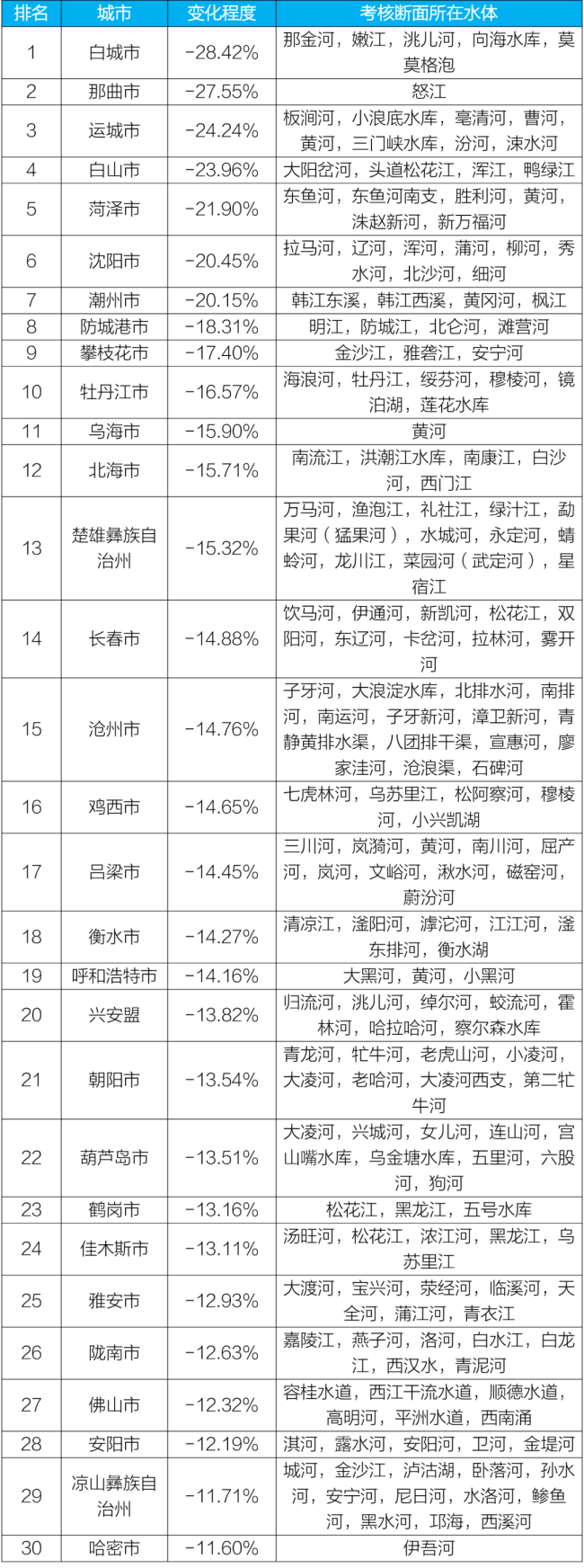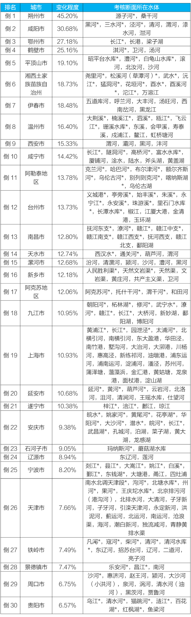 白城、那曲和運城等30個城市國家地表水考核斷面水環(huán)境質量變化情況相對較好(從第1名至第30名),朔州、咸陽和鄂州等30個城市國家地表水考核斷面水環(huán)境質量變化情況相對較差(從倒數(shù)第1名至倒數(shù)第30名)。見附表3—附表4。