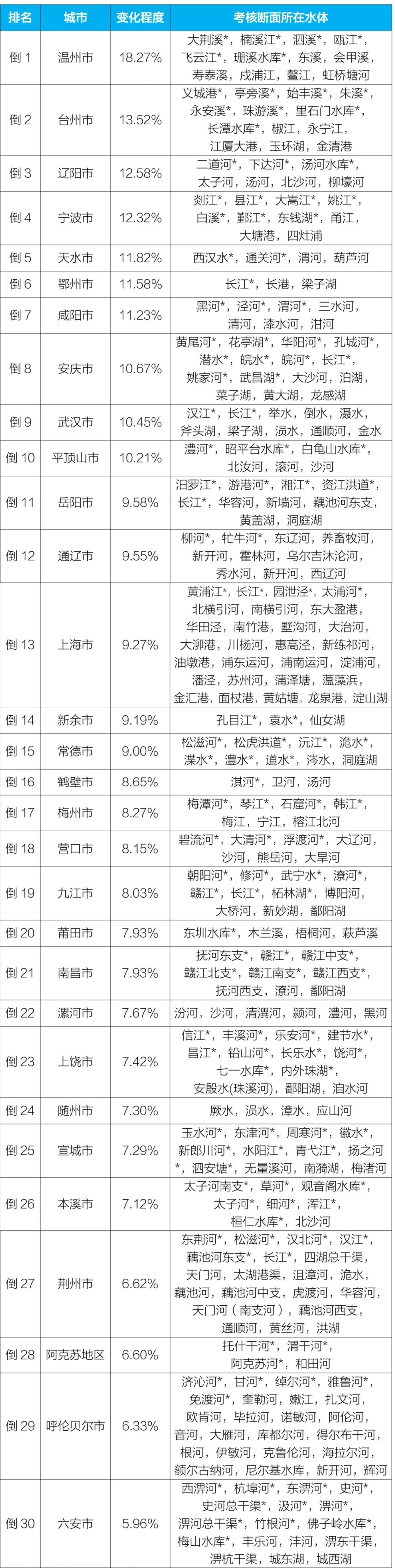 石河子市、白城市和烏海市等30個(gè)城市國(guó)家地表水考核斷面水環(huán)境質(zhì)量變化情況相對(duì)較好(從第1名至第30名),溫州市、臺(tái)州市和遼陽(yáng)市等30個(gè)城市國(guó)家地表水考核斷面水環(huán)境質(zhì)量變化情況相對(duì)較差(從倒數(shù)第1名至倒數(shù)第30名)。見(jiàn)附表3—4。
