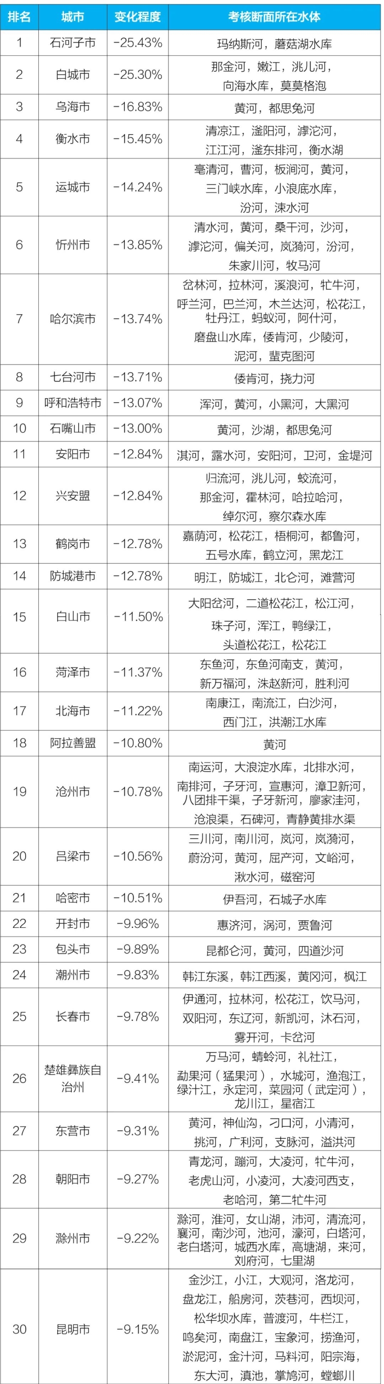 2023年1—6月國(guó)家地表水考核斷面水環(huán)境質(zhì)量變化情況排名前30位城市及所在水體