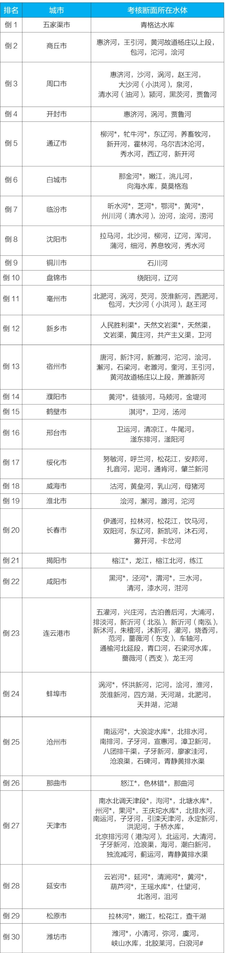2023年1—6月國(guó)家地表水考核斷面水環(huán)境質(zhì)量狀況排名后30位城市及所在水體