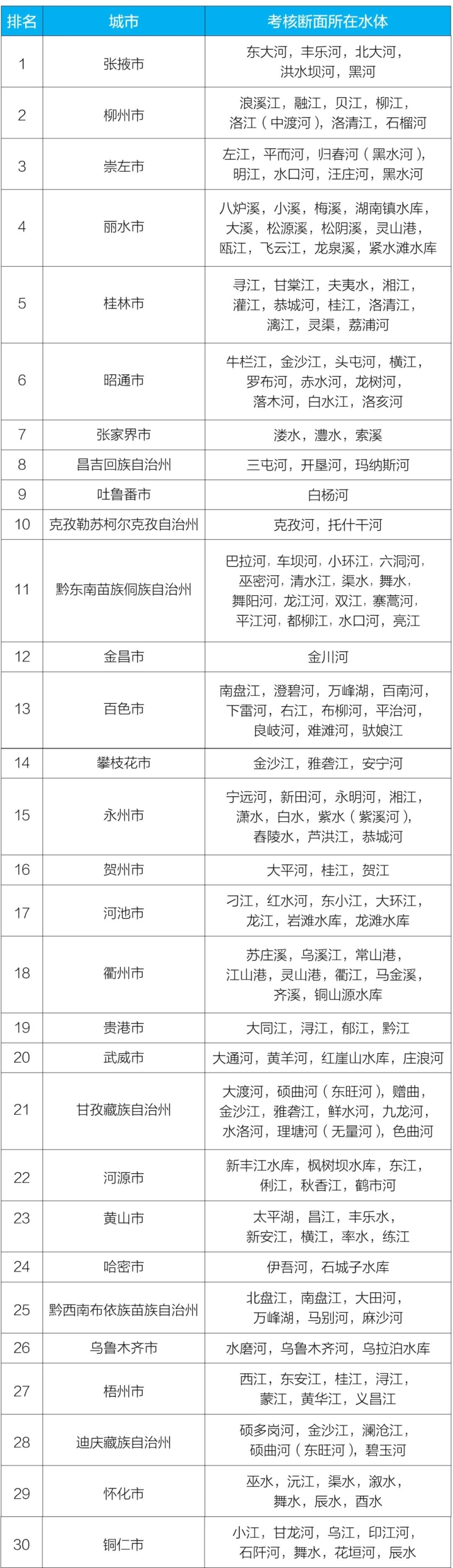 2023年1—6月國(guó)家地表水考核斷面水環(huán)境質(zhì)量狀況排名前30位城市及所在水體