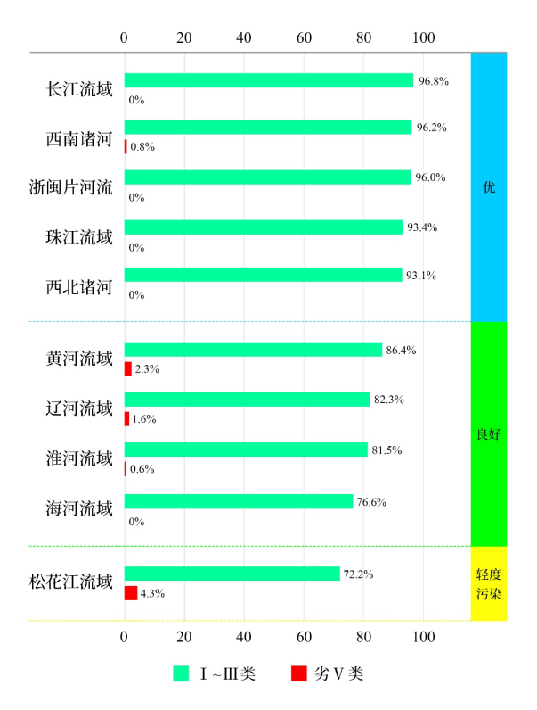 1—6月,長(zhǎng)江、黃河、珠江、松花江、淮河、海河、遼河等七大流域及西北諸河、西南諸河和浙閩片河流水質(zhì)優(yōu)良(Ⅰ—Ⅲ類)斷面比例為89.1%,同比上升1.8個(gè)百分點(diǎn);劣Ⅴ類斷面比例為0.7%,同比下降0.1個(gè)百分點(diǎn)。主要污染指標(biāo)為化學(xué)需氧量、高錳酸鹽指數(shù)和五日生化需氧量。其中,長(zhǎng)江流域、西南諸河、浙閩片河流、珠江流域和西北諸河水質(zhì)為優(yōu);黃河、遼河、淮河和海河流域水質(zhì)良好;松花江流域?yàn)檩p度污染。