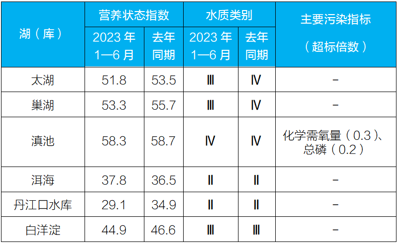 1—6月,監(jiān)測(cè)的208個(gè)重點(diǎn)湖(庫(kù))中,水質(zhì)優(yōu)良(Ⅰ—Ⅲ類)湖庫(kù)個(gè)數(shù)占比80.3%,同比上升4.1個(gè)百分點(diǎn);劣Ⅴ類水質(zhì)湖庫(kù)個(gè)數(shù)占比5.3%,同比上升0.1個(gè)百分點(diǎn)。主要污染指標(biāo)為總磷、化學(xué)需氧量和高錳酸鹽指數(shù)。204個(gè)監(jiān)測(cè)營(yíng)養(yǎng)狀態(tài)的湖(庫(kù))中,中度富營(yíng)養(yǎng)的6個(gè),占2.9%;輕度富營(yíng)養(yǎng)的39個(gè),占19.1%;其余湖(庫(kù))為中營(yíng)養(yǎng)或貧營(yíng)養(yǎng)狀態(tài)。其中,太湖和巢湖水質(zhì)均良好、輕度富營(yíng)養(yǎng);滇池為輕度污染、輕度富營(yíng)養(yǎng),主要污染指標(biāo)為化學(xué)需氧量和總磷;洱海水質(zhì)為優(yōu)、中營(yíng)養(yǎng);丹江口水庫(kù)水質(zhì)為優(yōu)、貧營(yíng)養(yǎng);白洋淀水質(zhì)良好、中營(yíng)養(yǎng)。