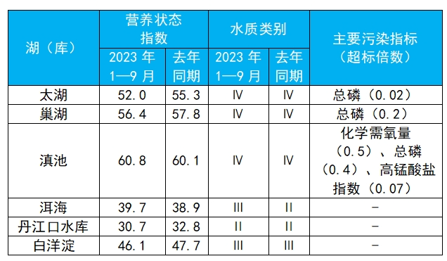 第三季度,監(jiān)測的209個重點湖(庫)中,水質(zhì)優(yōu)良(Ⅰ—Ⅲ類)湖庫個數(shù)占比72.2%,同比上升4.1個百分點;劣Ⅴ類水質(zhì)湖庫個數(shù)占比3.8%,同比下降1.0個百分點。主要污染指標(biāo)為總磷、化學(xué)需氧量和高錳酸鹽指數(shù)。204個監(jiān)測營養(yǎng)狀態(tài)的湖(庫)中,中度富營養(yǎng)的18個,占8.8%;輕度富營養(yǎng)的50個,占24.5%;其余湖(庫)為中營養(yǎng)或貧營養(yǎng)狀態(tài)。其中,太湖為輕度污染、輕度富營養(yǎng),主要污染指標(biāo)為總磷;巢湖為輕度污染、中度富營養(yǎng),主要污染指標(biāo)為總磷;滇池為中度污染、中度富營養(yǎng),主要污染指標(biāo)為化學(xué)需氧量、總磷和高錳酸鹽指數(shù);洱海水質(zhì)良好、中營養(yǎng);丹江口水庫水質(zhì)為優(yōu)、中營養(yǎng);白洋淀為輕度污染(主要受洪災(zāi)影響)、中營養(yǎng),定類指標(biāo)為溶解氧。