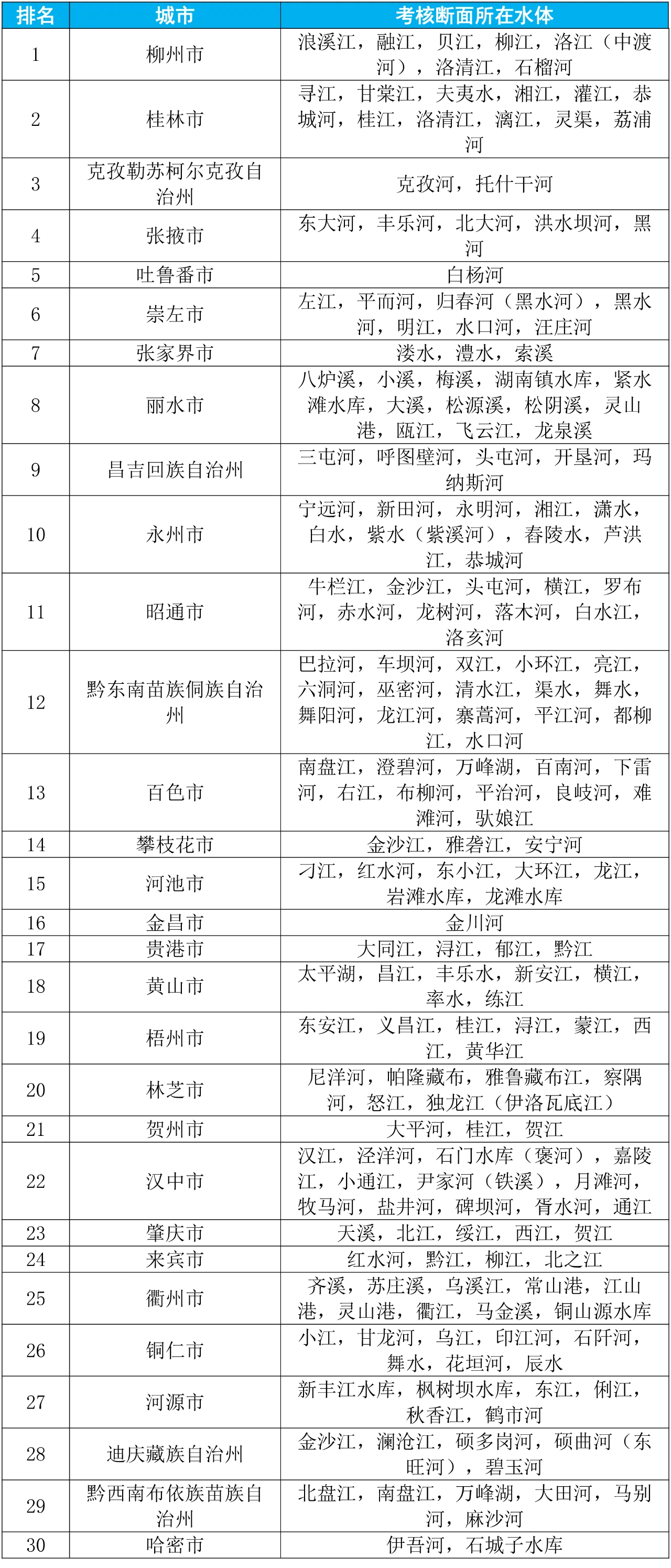 1—9月,全國地級及以上城市中,柳州市、桂林市和克孜勒蘇柯爾克孜自治州等30個城市國家地表水考核斷面水環(huán)境質(zhì)量相對較好(從第1名至第30名),五家渠市、商丘市和通遼市等30個城市國家地表水考核斷面水環(huán)境質(zhì)量相對較差(從倒數(shù)第1名至倒數(shù)第30名),見附表1—2。