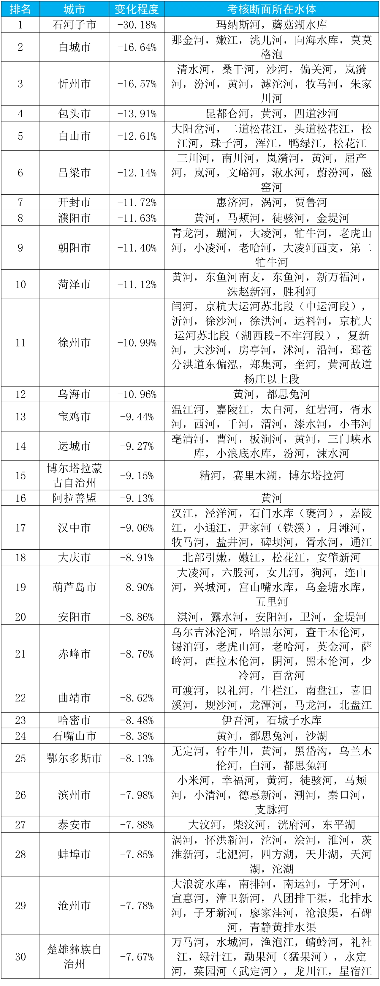 石河子市、白城市和忻州市等30個城市國家地表水考核斷面水環(huán)境質(zhì)量變化情況相對較好(從第1名至第30名),杭州市、臺州市和鹽城市等30個城市國家地表水考核斷面水環(huán)境質(zhì)量變化情況相對較差(從倒數(shù)第1名至倒數(shù)第30名)。見附表3—4。