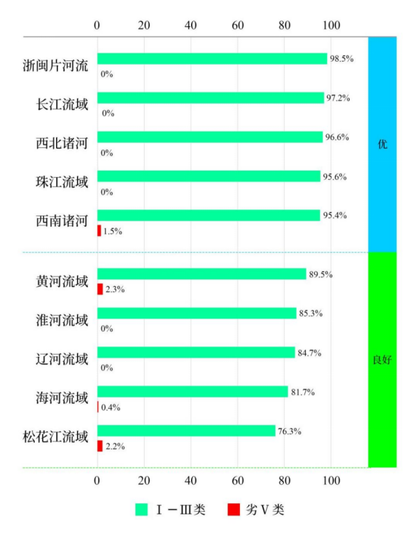 1—3月,長江、黃河、珠江、松花江、淮河、海河、遼河等七大流域及西北諸河、西南諸河和浙閩片河流水質(zhì)優(yōu)良(Ⅰ—Ⅲ類)斷面比例為91.5%,同比上升1.2個百分點;劣Ⅴ類斷面比例為0.5%,同比上升0.1個百分點。主要污染指標(biāo)為化學(xué)需氧量、高錳酸鹽指數(shù)和氨氮。其中,長江流域、珠江流域、浙閩片河流、西北諸河和西南諸河水質(zhì)為優(yōu);黃河流域、松花江流域、淮河流域、海河流域和遼河流域水質(zhì)良好。