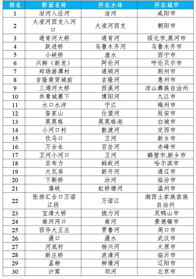 咸陽市泔河入涇河、朝陽市大凌河西支入河口和綏化市/黑河市通肯河大橋等30個國家地表水考核斷面水環(huán)境質(zhì)量變化情況相對較好(從第1名至第30名),渭南市裕西、天津市新老米店閘和玉溪市化念水庫等30個國家地表水考核斷面水環(huán)境質(zhì)量變化情況相對較差(從倒數(shù)第1名至倒數(shù)第30名),見附表3—4。