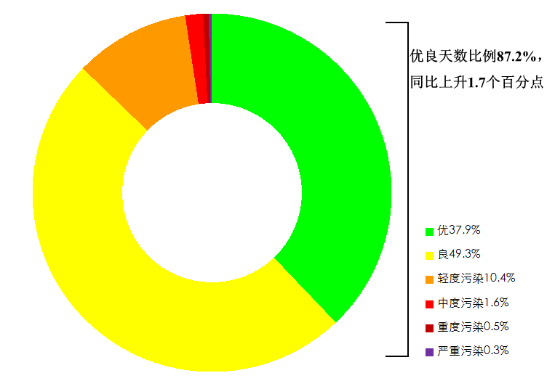 1—12月,全國339個地級及以上城市平均空氣質(zhì)量優(yōu)良天數(shù)比例為87.2%,同比上升1.7個百分點;平均重度及以上污染天數(shù)比例為0.9%,同比下降0.7個百分點。由沙塵天氣導(dǎo)致的平均超標(biāo)天數(shù)比例為1.9%,其中重度及以上污染天數(shù)比例為0.4%。