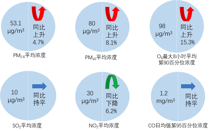 1月,全國(guó)339個(gè)地級(jí)及以上城市PM2.5平均濃度為53.1微克/立方米,同比上升4.7%;PM10平均濃度為80微克/立方米,同比上升8.1%;O3平均濃度為98微克/立方米,同比上升15.3%;SO2平均濃度為10微克/立方米,同比持平;NO2平均濃度為30微克/立方米,同比下降6.2%;CO平均濃度為1.2毫克/立方米,同比持平。