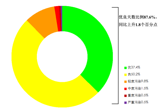 1—9月,全國339個地級及以上城市平均空氣質(zhì)量優(yōu)良天數(shù)比例為87.6%,同比上升1.8個百分點;平均重度及以上污染天數(shù)比例為1.1%,同比持平。由沙塵天氣導(dǎo)致的平均超標天數(shù)比例為3.1%,其中重度及以上污染天數(shù)比例為0.7%。