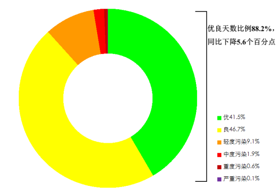 11月,全國339個地級及以上城市平均空氣質量優(yōu)良天數(shù)比例為88.2%,同比下降5.6個百分點;平均重度及以上污染天數(shù)比例為0.7%,同比上升0.4個百分點。由沙塵天氣導致的平均超標天數(shù)比例為5.3%,其中重度及以上污染天數(shù)比例為0.3%。
