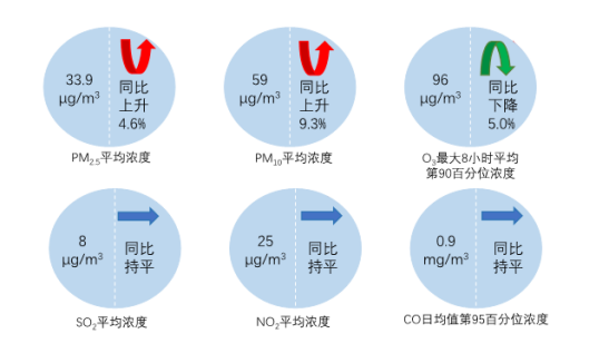 11月,全國339個地級及以上城市PM2.5平均濃度為33.9微克/立方米,同比上升4.6%;PM10平均濃度為59微克/立方米,同比上升9.3%;O3平均濃度為96微克/立方米,同比下降5.0%;SO2平均濃度為8微克/立方米,同比持平;NO2平均濃度為25微克/立方米,同比持平;CO平均濃度為0.9毫克/立方米,同比持平。