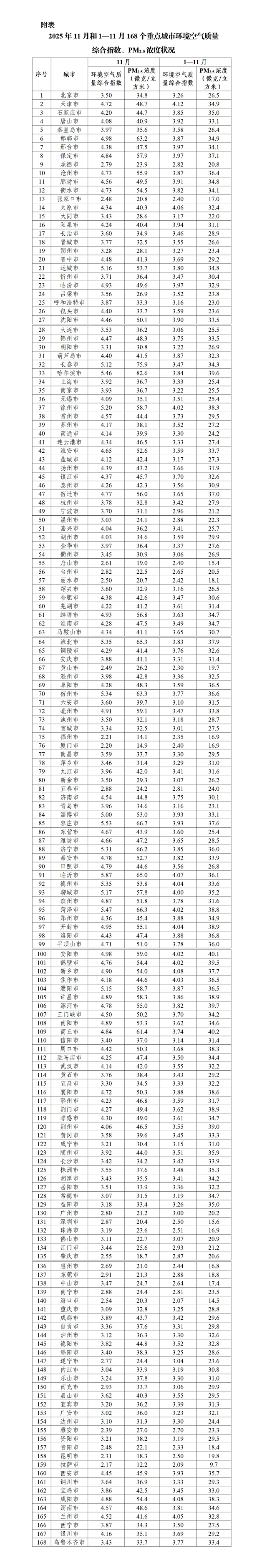 11月和1—11月168個重點城市環(huán)境空氣質量綜合指數(shù)、PM2.5濃度狀況詳見附表。