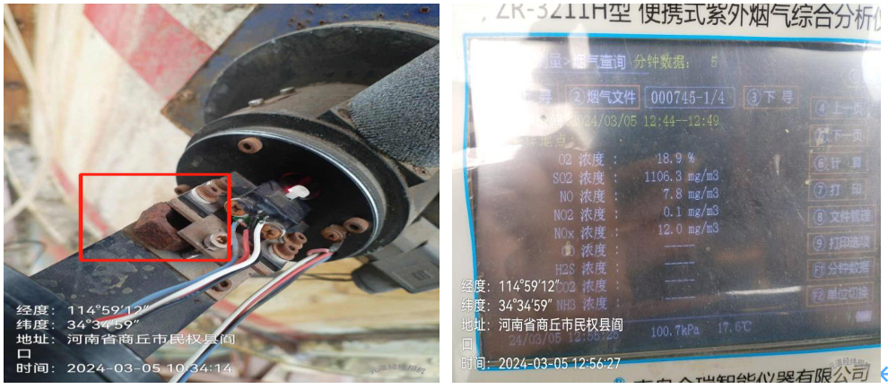 粉塵檢測(cè)儀激光發(fā)射器被人為用螺母墊高;監(jiān)測(cè)結(jié)果顯示二氧化硫濃度1106.3mg/m3,折算后濃度為1580.42mg/m3