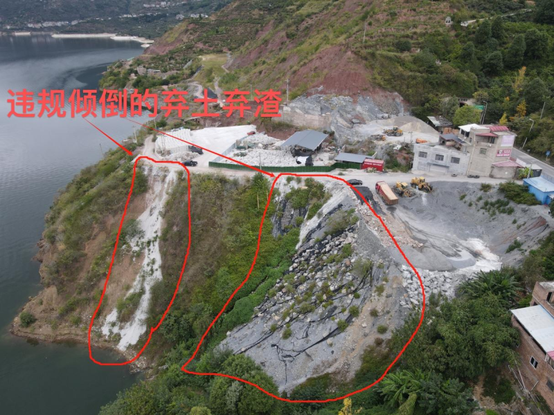 圖1 2024年10月25日,督察組現(xiàn)場(chǎng)督察發(fā)現(xiàn),雅安市漢源縣富泉鎮(zhèn)中海村大渡河自然岸坡被違規(guī)傾倒約1700立方米洞渣、廢漿和建筑垃圾